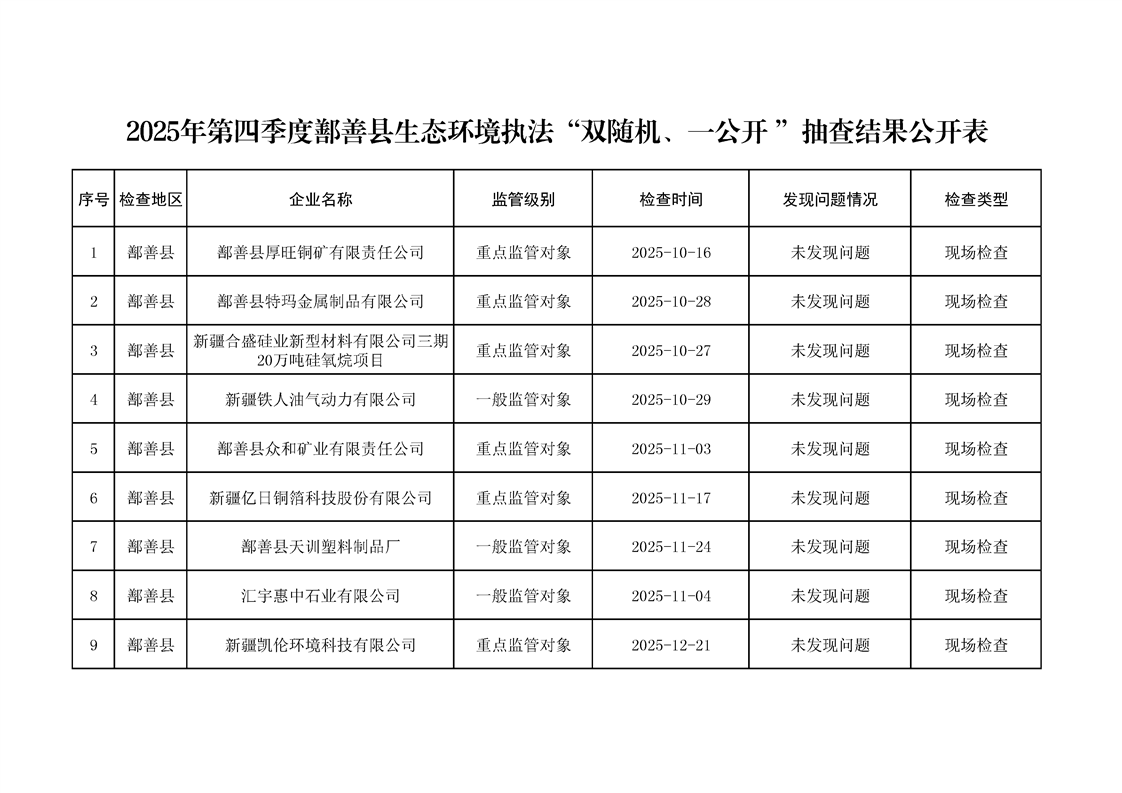 2025年第四季度鄯善县生态环境执法“双随机、一公开 ”抽查结果公开表