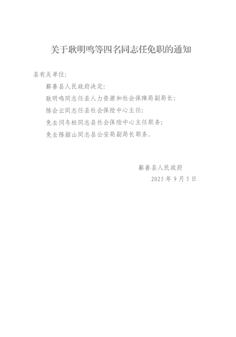 鄯政干〔2025〕12号 关于耿明鸣等四名同志任免职的通知
