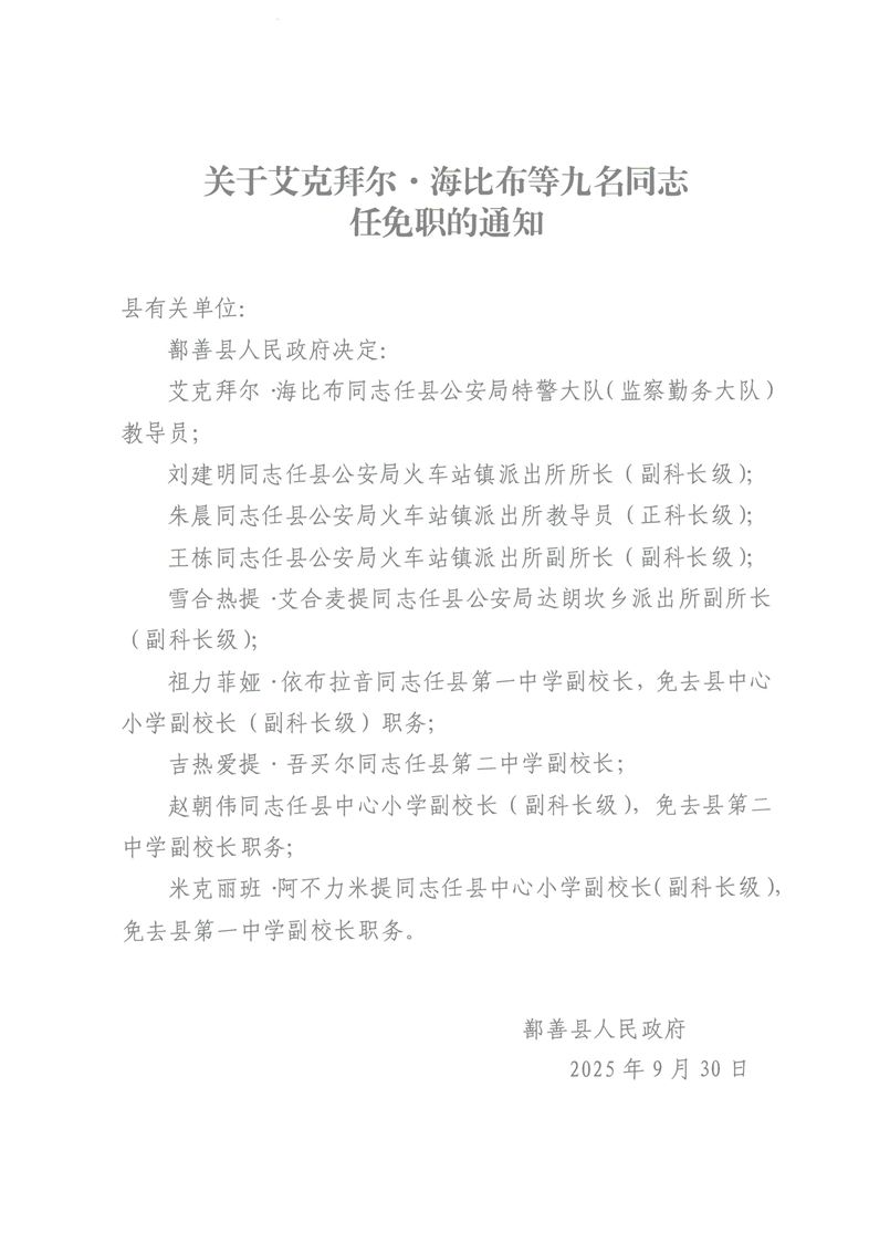 鄯政干〔2025〕13号 关于艾克拜尔·海比布等九名同志任免职的通知