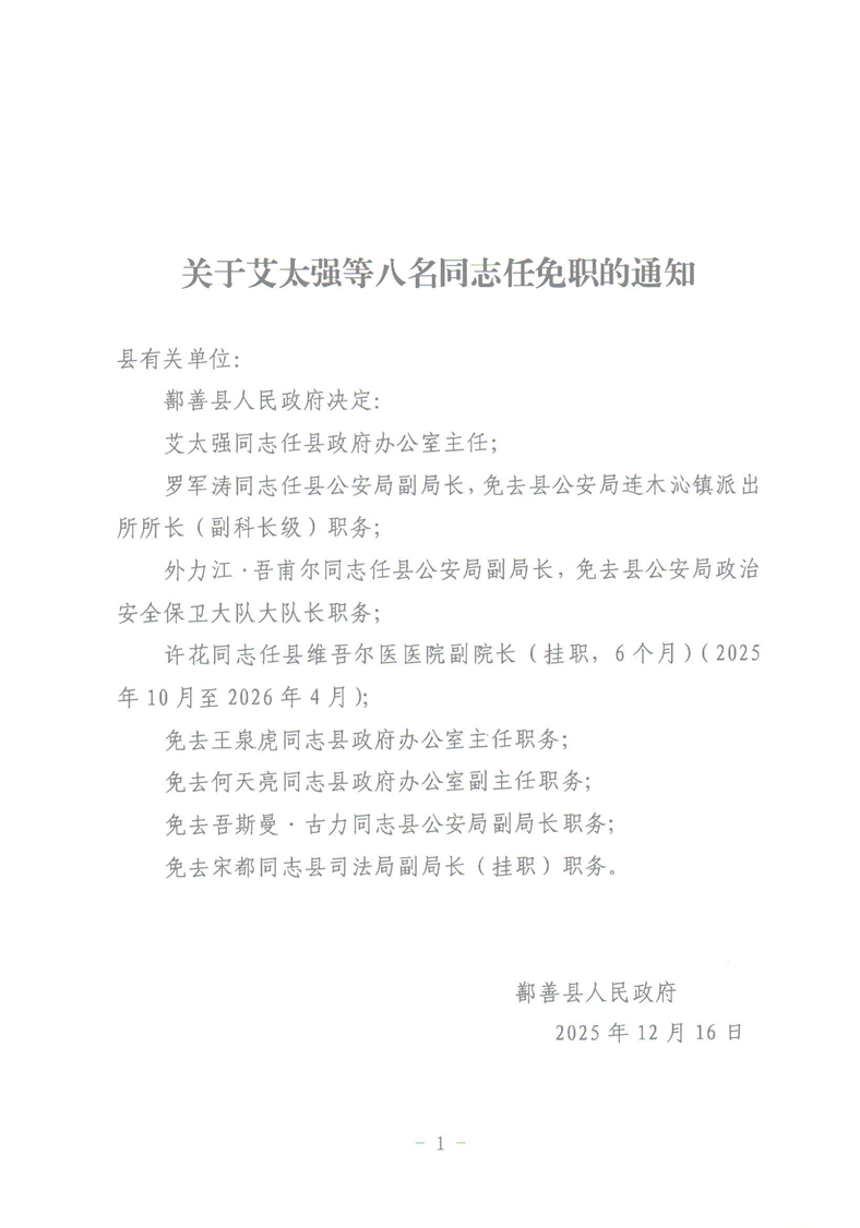 鄯政干〔2025〕14号 关于艾太强等八名同志任免职的通知