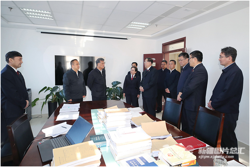 12月5日,自治区党委书记马兴瑞、自治区主席艾尔肯·吐尼亚孜在自治区人民检察院第二检察部调研工作运行、队伍建设情况。石榴云/新疆日报记者崔志坚摄