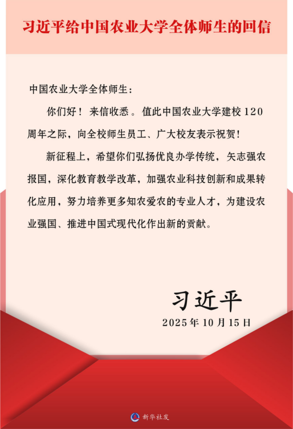 新华社北京10月16日电近日,中共中央总书记、国家主席、中央军委主席习近平给中国农业大学全体师生回信,在中国农业大学建校120周年之际,向全校师生员工、广大校友表示祝贺。