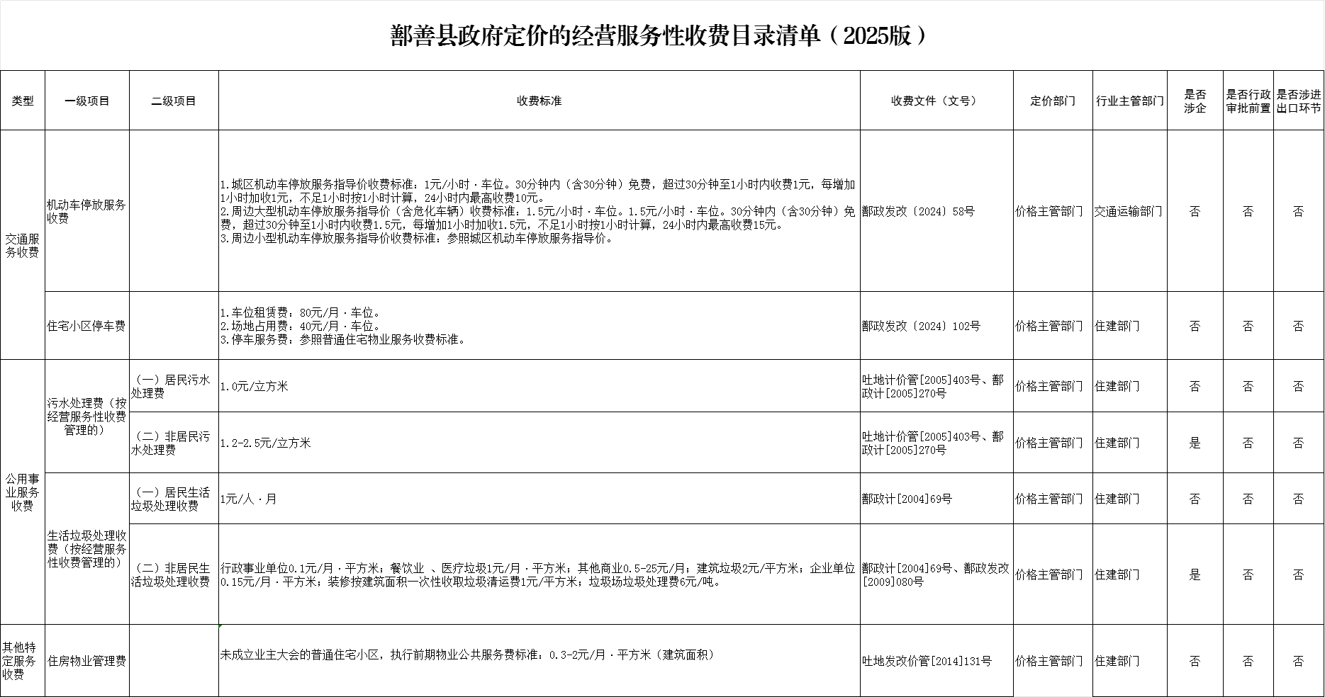鄯善县政府定价的经营服务性收费目录清单(2025版)