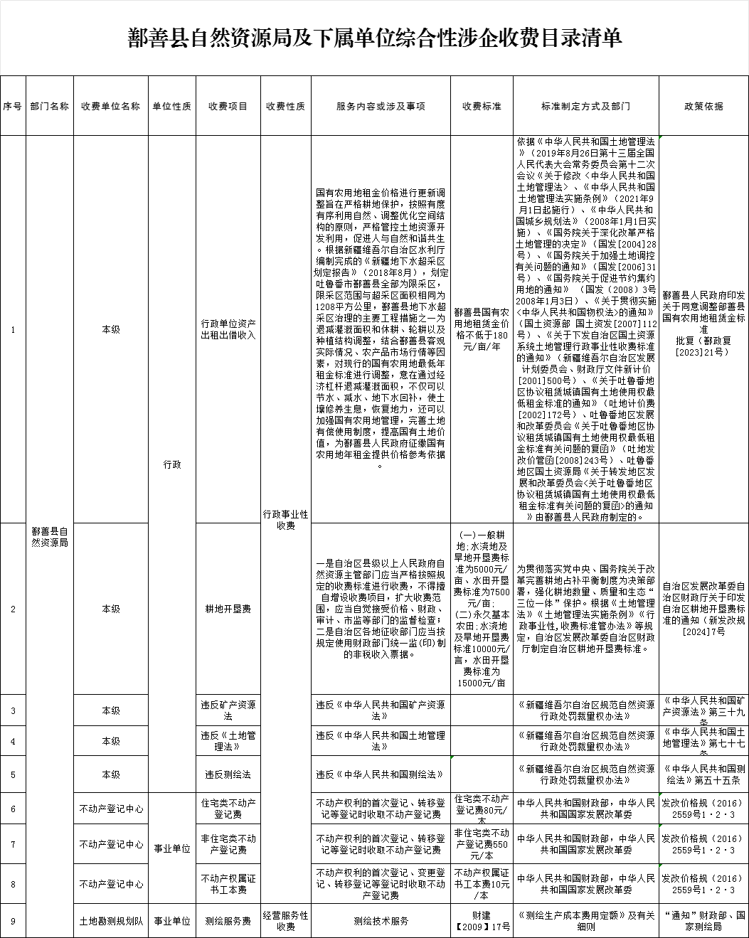 鄯善县自然资源局及下属单位综合性涉企收费目录清单