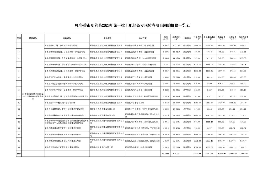 吐鲁番市鄯善县2026年第一批土地储备专项债券项目回购价格一览表