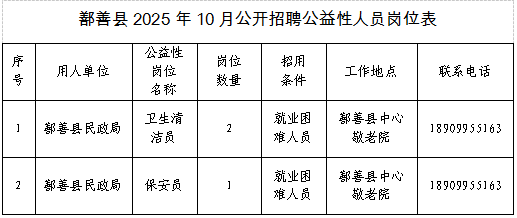 根据自治区人力资源和社会保障厅印发《关于进一步做好公益性岗位开发管理有关工作的通知》(新人社发〔2020〕8号)精神,进一步加强公益性岗位的开发和管理,凸显公益性岗位“托底线、救急难、临时性、公益性”属性,结合工作实际,按照“公开、公正、公平”的原则,现就2025年鄯善县10月份公益性岗位人员招聘事宜公告如下: