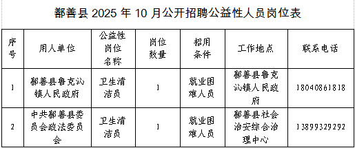 根据自治区人力资源和社会保障厅印发《关于进一步做好公益性岗位开发管理有关工作的通知》(新人社发〔2020〕8号)精神,进一步加强公益性岗位的开发和管理,凸显公益性岗位“托底线、救急难、临时性、公益性”属性,结合工作实际,按照“公开、公正、公平”的原则,现就2025年鄯善县10月份公益性岗位人员招聘事宜公告如下: