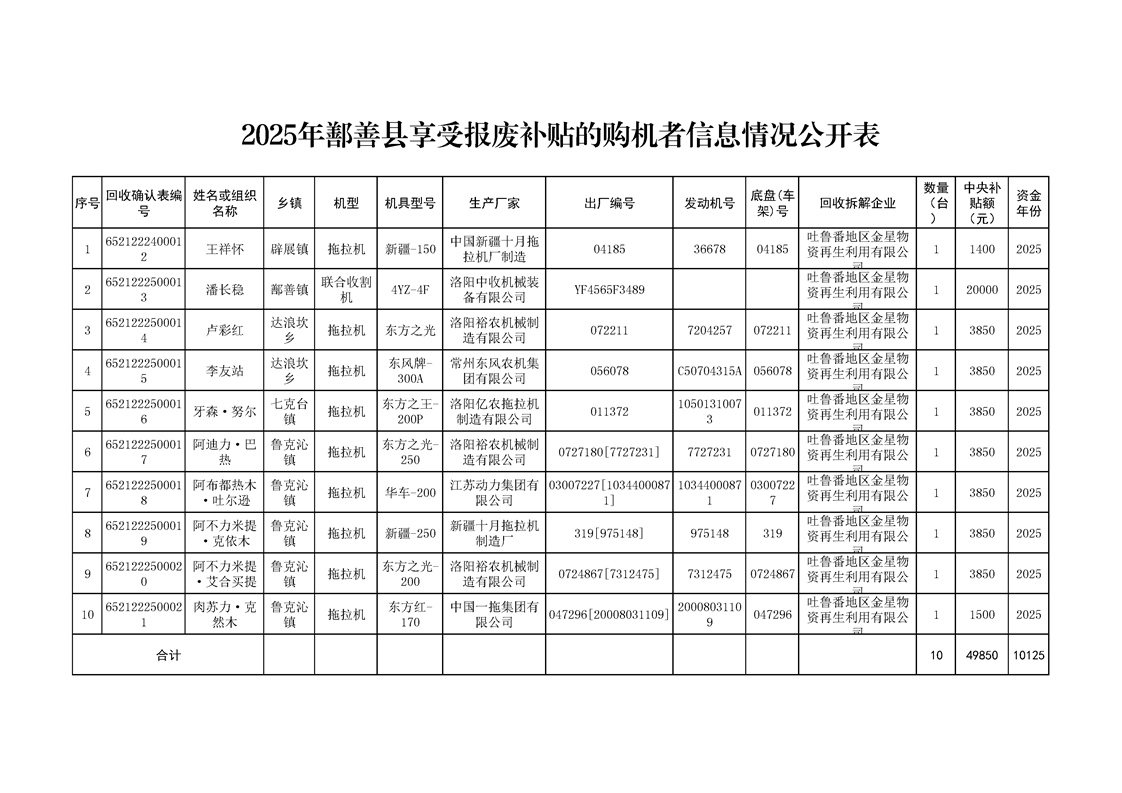 2025年鄯善县享受报废补贴的购机者信息情况公开表