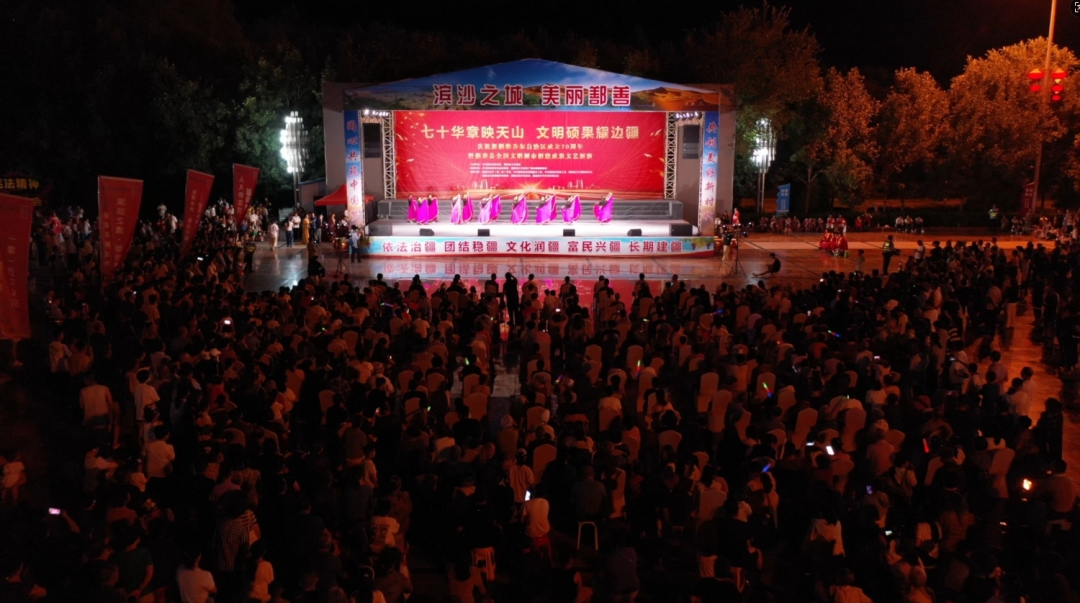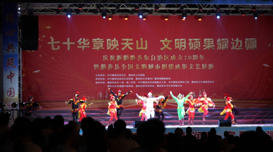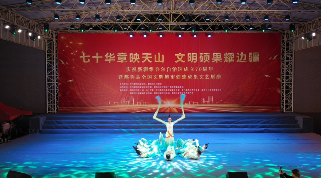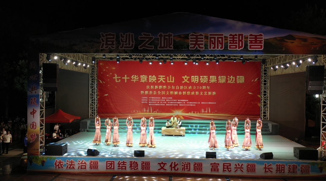 鄯善县融媒体中心讯(记者 陶子靖)为庆祝新疆维吾尔自治区成立70周年,同时全面展示我县全国文明城市创建的丰硕成果,进一步增强市民对文明创建的认同感与参与度,8月15日,我县在文化广场举办了以“七十华章映天山 文明硕果耀边疆”为主题的大型文艺展演活动。