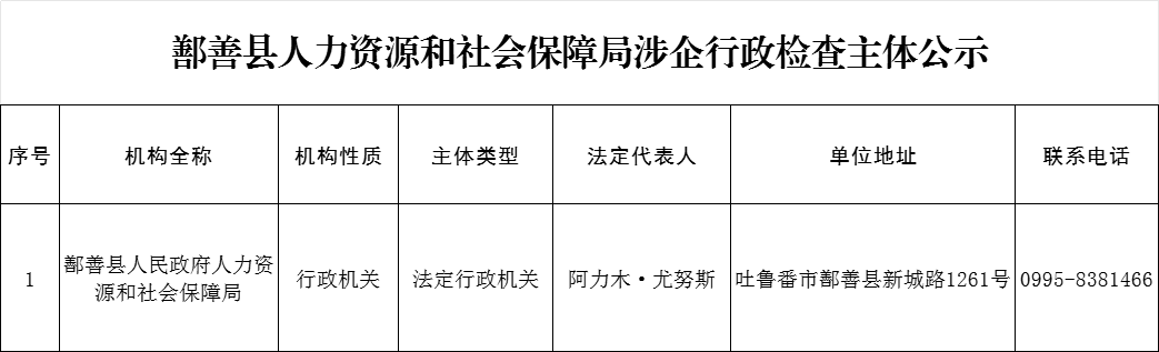 鄯善县人力资源和社会保障局涉企行政检查主体公示
