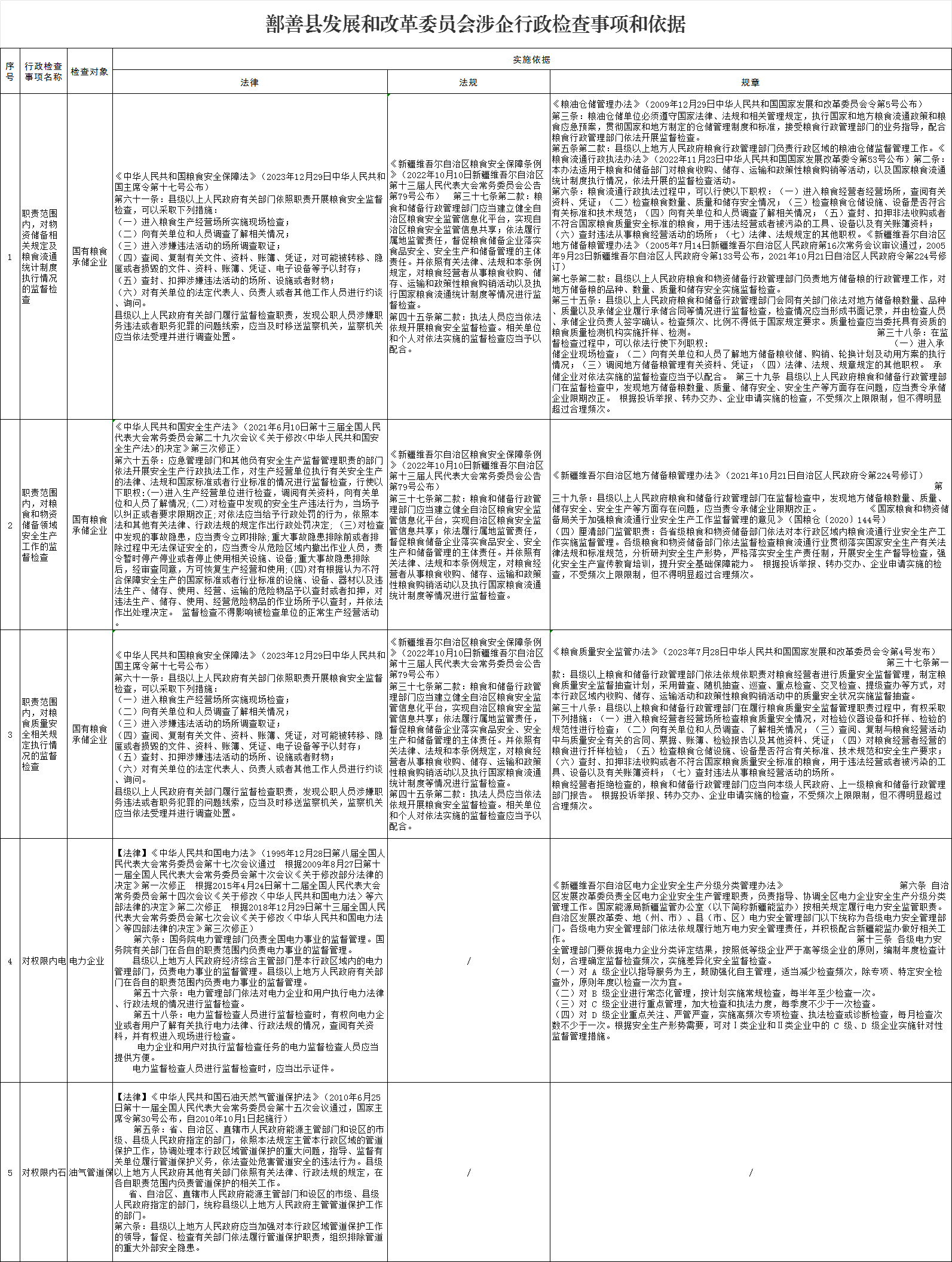 鄯善县发展和改革委员会(鄯善县粮食和物资储备局)涉企行政检查事项和依据