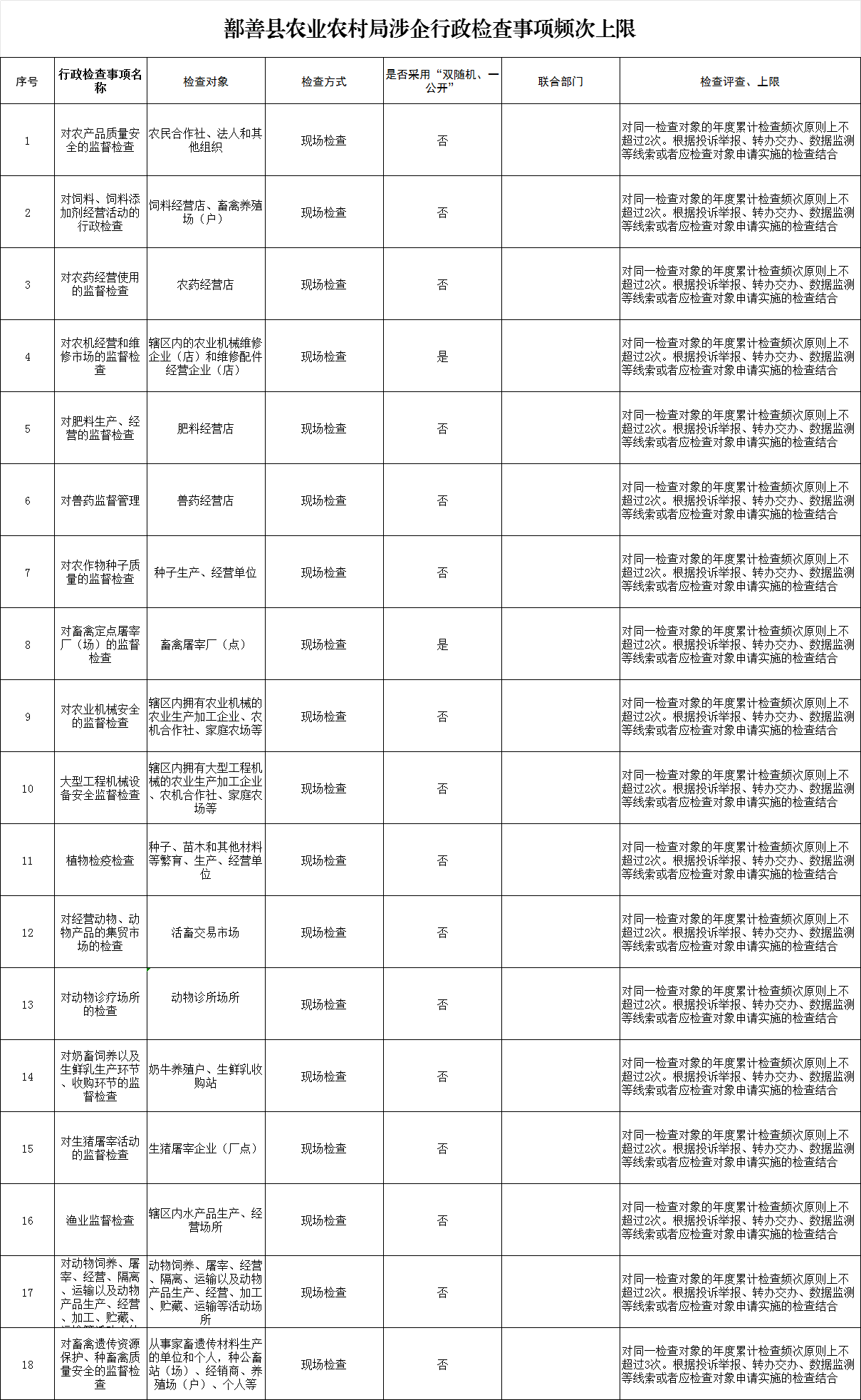 鄯善县农业农村局涉企行政检查事项频次上限