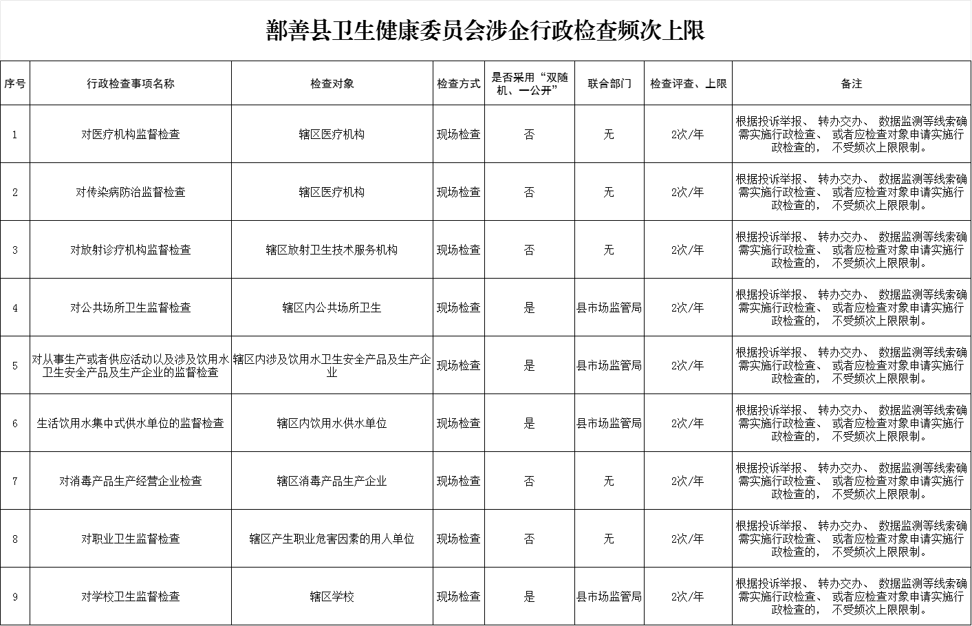 鄯善县卫生健康委员会涉企行政检查频次上限