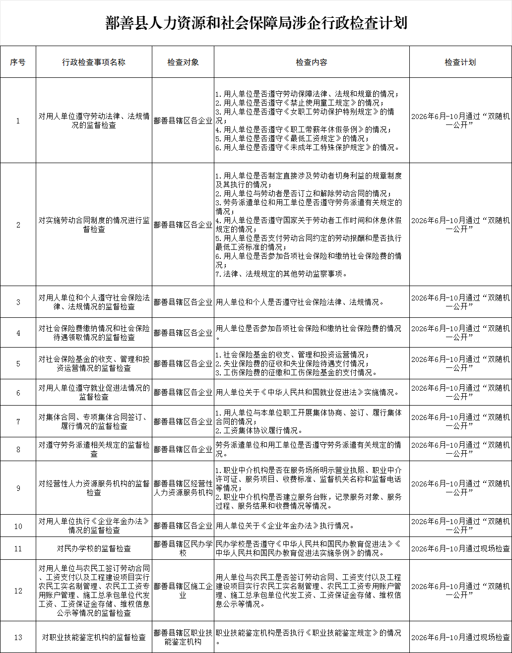 鄯善县人力资源和社会保障局涉企行政检查计划