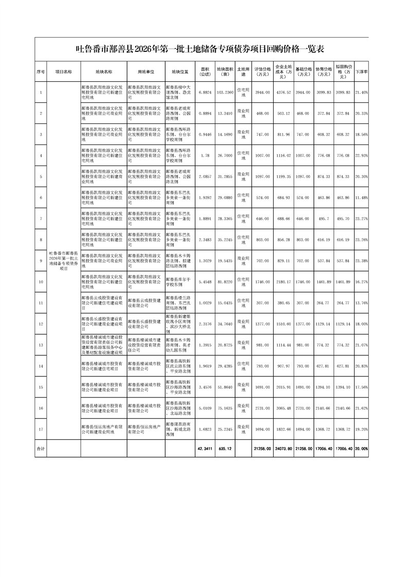 吐鲁番市鄯善县2026年第一批土地储备专项债券项目回购价格一览表