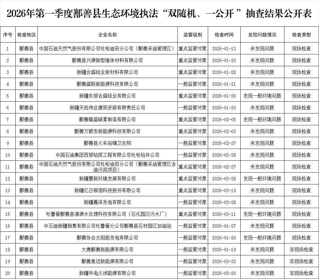 2026年第一季度鄯善县生态环境执法“双随机、一公开 ”抽查结果公开